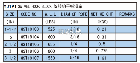 • 產品描述:該款滑輪有很多款式,有平板旋轉環的,旋轉鉤的,固定環的,也有平板平座可以固定的,尺寸小,靈活,從1-1/2”到5寸,拉力從525 LBS到1900 LBS,可以適用于很多小噸位的起重作業工作。于澳洲和美洲的牧場上,有廣泛應用。