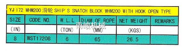 • 產品描述:該產品代號WHM200,只有一個尺寸,8寸拉力6T。最大繩徑65MM,適用范圍廣