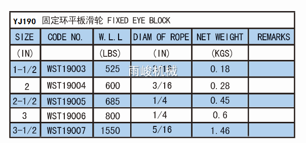 • 產品描述:該款滑輪有很多款式,有平板旋轉環的,旋轉鉤的,固定環的,也有平板平座可以固定的,尺寸小,靈活,從1-1/2”到5寸,拉力從525 LBS到1900 LBS,可以適用于很多小噸位的起重作業工作。于澳洲和美洲的牧場上,有廣泛應用。