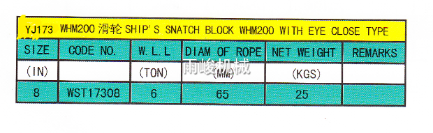 • 產品描述:該產品代號WHM200,只有一個尺寸,8寸拉力6T。最大繩徑65MM,適用范圍廣