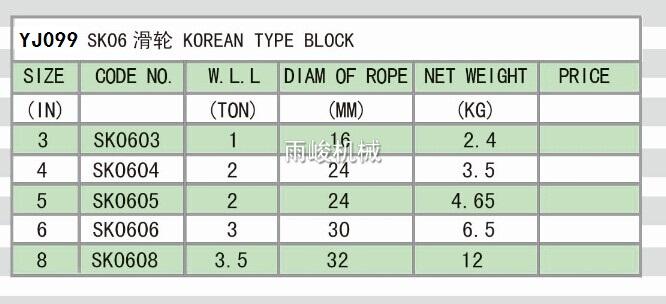 • Product description: This block is the best seller of Korean Type Block. The size is from 3" to 6", the working load from 1T to 3T, and the Diam of Rope from 16MM to 30MM, it is suit for small working load limit lifting w