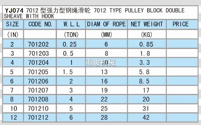 YJ074 7012 TYPE PULLEY BLOCK DOUBLE SHEAVE WITH HOOK