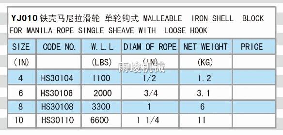 YJ010 MALLEABLE IRON SHELL BLOCK FOR MANILA ROPE SINGLE SHEAVE WITH LOOSE HOOK