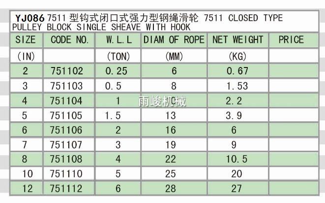 YJ086 7511 CLOSED TYPE PULLEY BLOCK SINGLE SHEAVE WITH HOOK